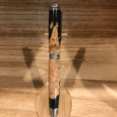 Chrome fountain pen with a burled maple and black acrylic body and top